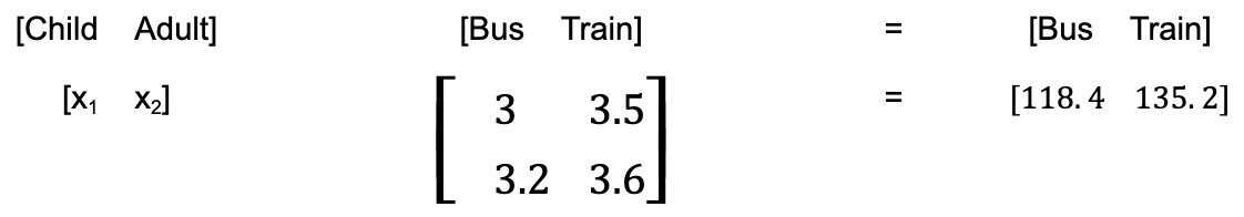 Since we’ve arranged the X matrix to be x1 as children and x2 as adults, this means that, on this trip, there were:
