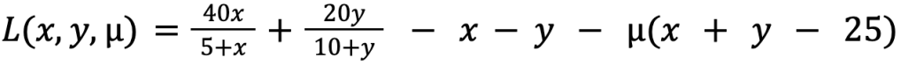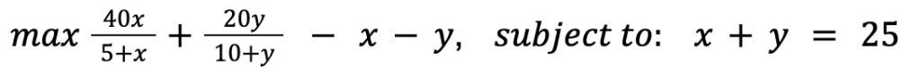 The business discovers that the profit is 20% of the sales minus its advertising costs. The firm wants to spend only $25 on these pieces of advertisements. With these needs (and constraints) being set by the business, we can calculate profit by determining how to allocate the advertising budget between the two advertisements.