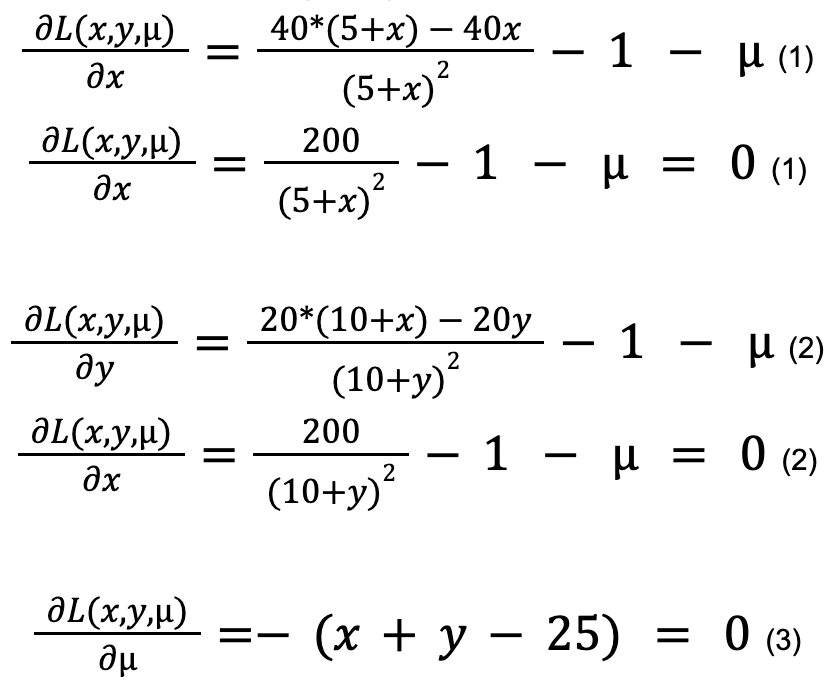 The partial derivative equations (x and y) imply that (5 + x)2 = (10 + y)2. There is also the implication that they are also equal, together, with the third equation, (5 + 25 – y)2 =(10 – y)2. Therefore, this equation only has one solution, y = 10.