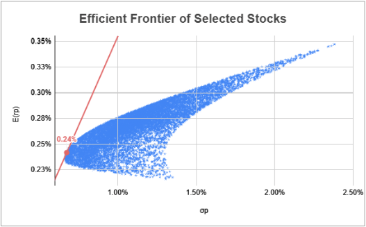 This output shows that, when we invest 100% into the risk-free rate (0% of our portfolio), we expect to see a .8% return with no risk, 0%. If we invest all of our investment money into this equally weighted portfolio, we can expect to see a .22% return at 1.05% risk. If we were to borrow 100% of our money (with the aim of earning ours and the borrowed back), we can expect to lose .35% at a 2.1% risk level.