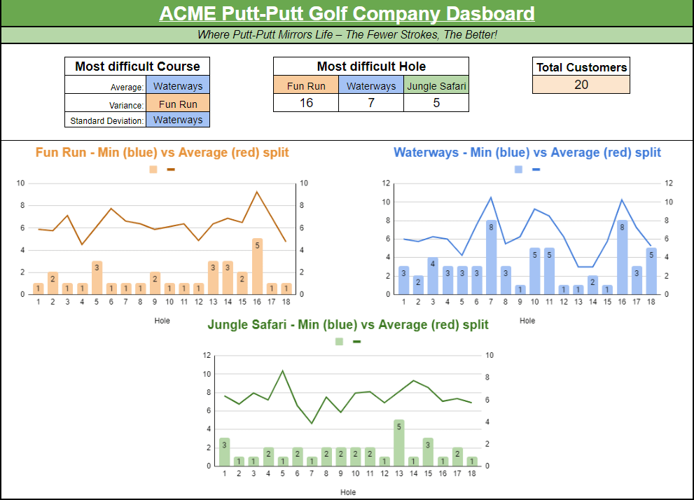 I have taken a similar approach as that September post, but used a different framework (again) to count values across these sheets, but also to take it a step further. I’ve used the perspective of a mini-golf, or putt-putt (whatever you want to call it), business to see the types of decisions and understandings that can be taken from the player information of the holes that they play.