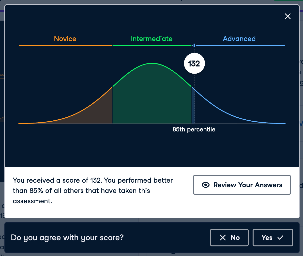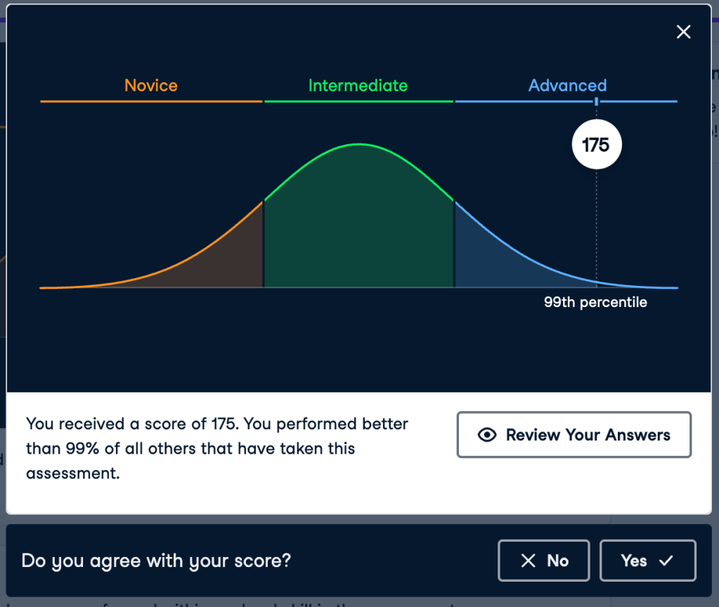 I noticed that you can assess your learning by taking a Skill Assessment based on a particular area. Thinking that this is a great opportunity to see how I’m stacking up against the impending Certificate assessment, I took all 4 of the SQL Skills Assessments: Data Management in SQL (PostgreSQL), Data Analysis in SQL (PostgreSQL), Exploratory Analysis Theory, and Statistical Experimentation Theory.
