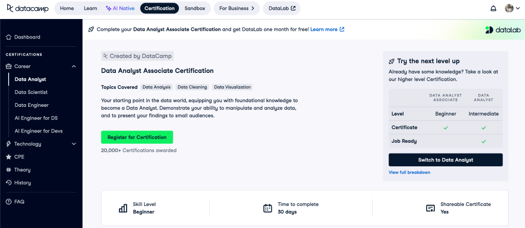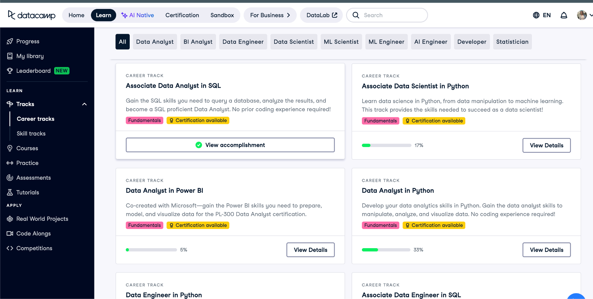 “The algorithm” was doing its thing one morning and I noticed that Datacamp was having a 50% Boxing Day sale. I decided to pick it up and started the learning trip on 27th December. I understand that this certification isn’t as valid or revered as something from the AWS, Microsoft, or Google pathways, but I felt like I was wasting time by not participating in some currency and learning. Especially as you can earn said certificates on the platform.