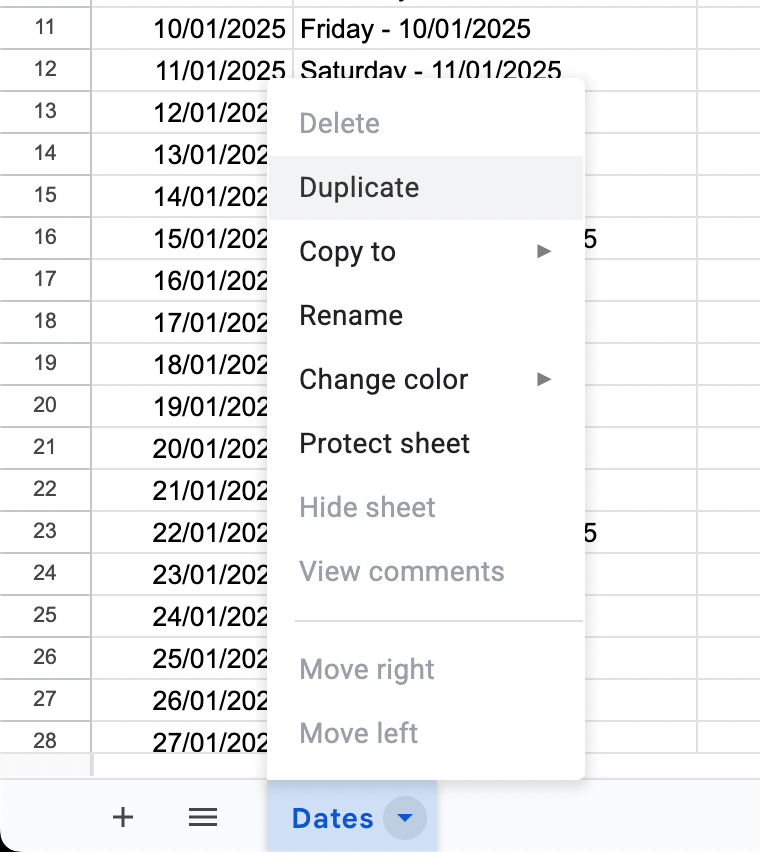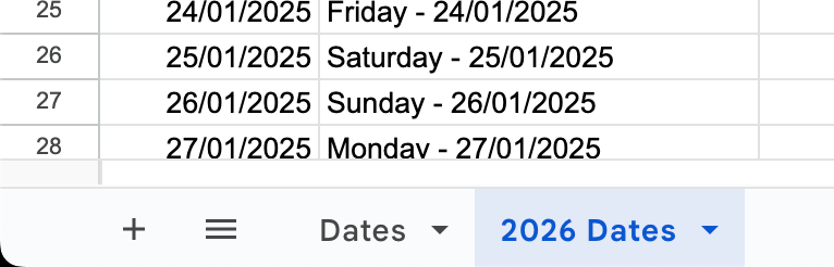- Duplicate the sheet Dates and rename it to 2026 Dates: