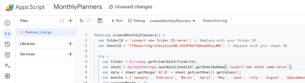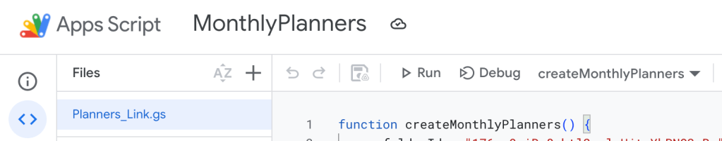 - Make sure that the function ‘createMonthlyPlanners’ has been selected, then click Run: