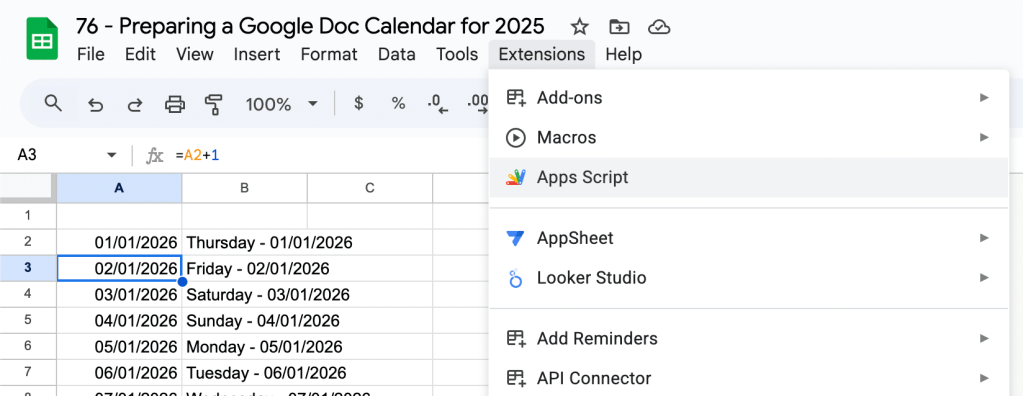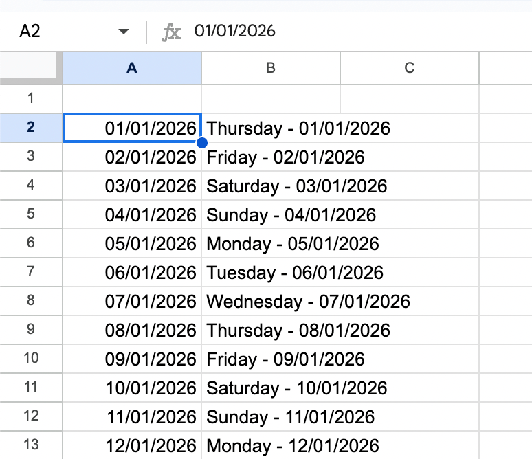 - Change Cell A2 to 01/01/2026; all subsequent cells will automatically adjust: