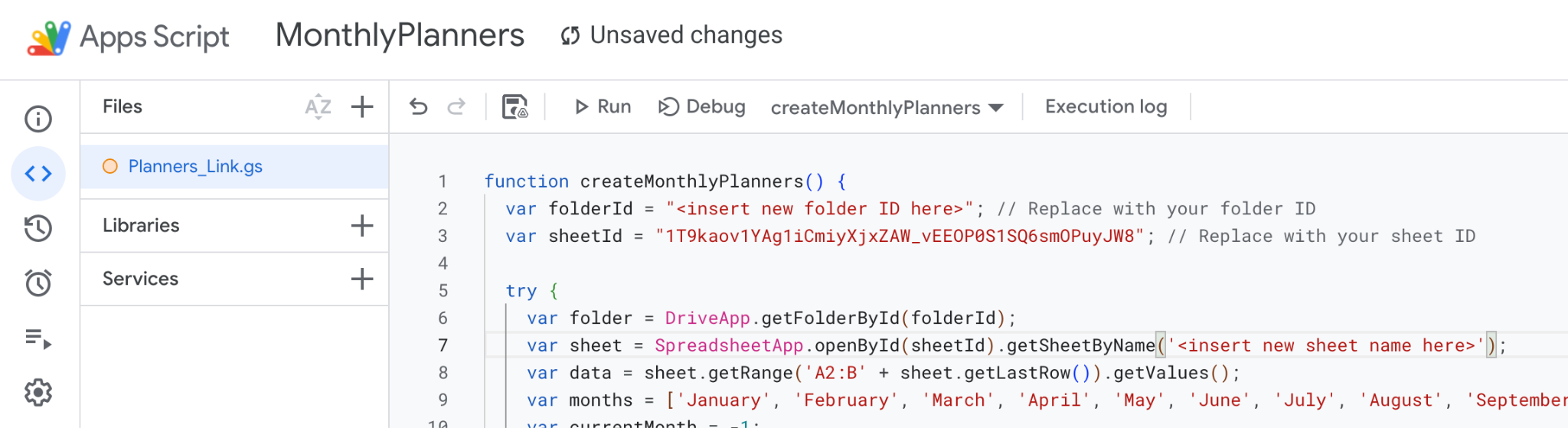 - Make sure that the function ‘createMonthlyPlanners’ has been selected, then click Run: