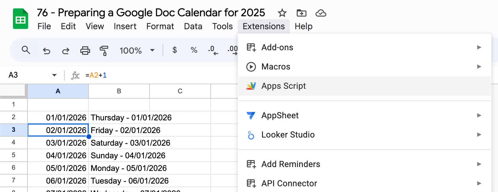 - Change Cell A2 to 01/01/2026; all subsequent cells will automatically adjust: