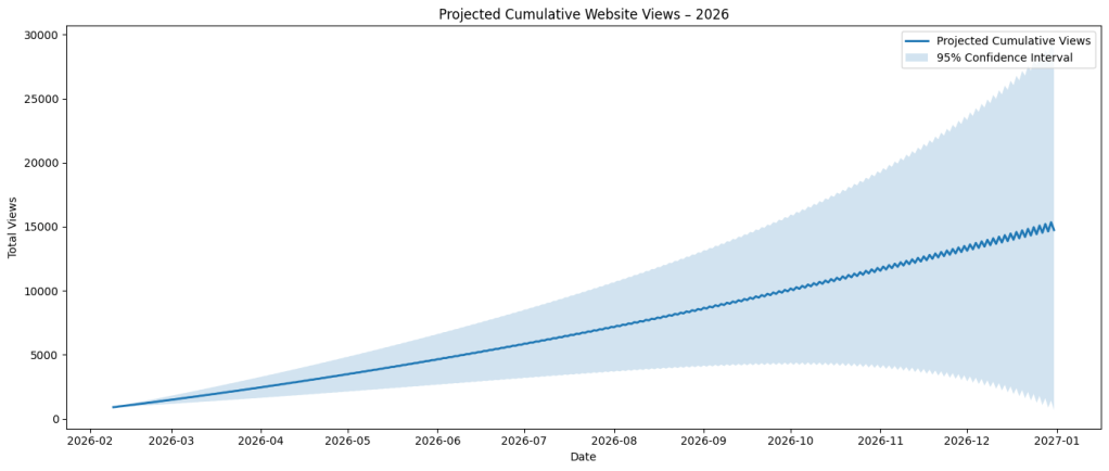 To test and put my own bias in check, I re-ran the model using the previous data, but this time including the anomalies, and this was output. This is really about putting this here as future evidence for December. Now, to think of a search term so that I can remember that it’s here; predicted 2026’s website forecasted views with anomalies/anomaly included. What I believe these numbers highlight is that SARIMAX can work well in the short-term regarding outliers, but will ultimately suffer from biasing the model upwards due to the change in variance: