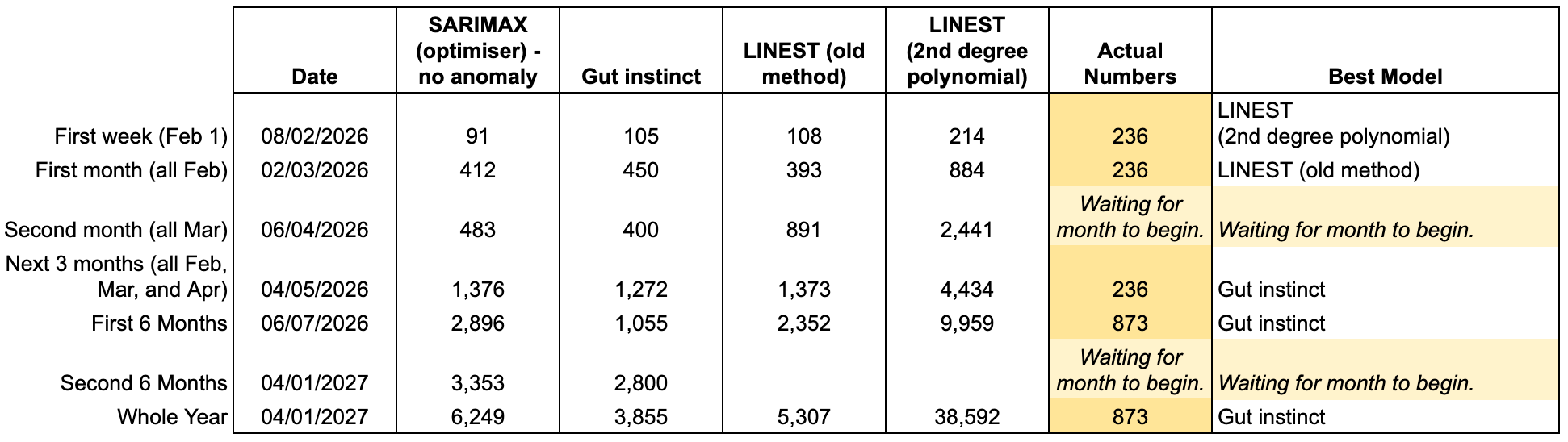I’ve produced a table to make decision-making easier for myself. This table shows the Python output from 02/02/2026, my gut instinct, parts of the 2025 forecasting system (LINEST 1 and MULTEST (2 degree polynomials)), and the observed views across 2026. These are then broken down into specified date buckets. If you’ve read this post, you’ll know what I mean by MULTEST.