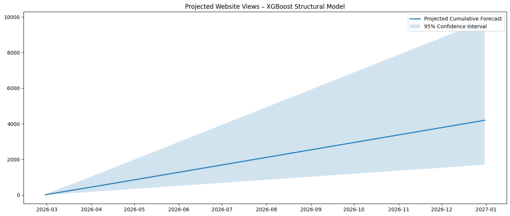 I also attempted a few different libraries on the data that I integrated, specifically prophet and xgboost. I’m going to run them in parallel over the next month to critique their validity, but I observed that, for my use case and current dataset, the confidence intervals (CIs) and forecasted views for prophet were wider and tracking alongside the original model(s), whereas the same aspects for xgboost were narrower CIs but lower (unlikely) view counts for the different time periods.
