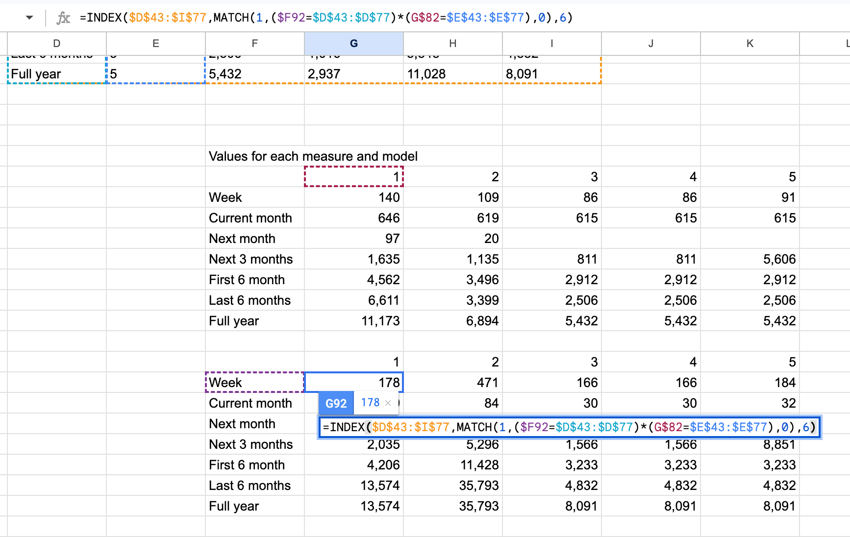 =INDEX($D$43:$I$77,MATCH(1,($F92=$D$43:$D$77)*(G$82=$E$43:$E$77),0),6)