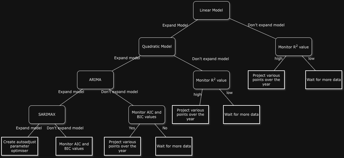 Whilst considering the forecasted numbers above, in combination with their confidence intervals (CIs), I realised that I was attempting to make the model fit the data as opposed to help drive the model’s accurate and consistent (where possible) output. Ultimately, this is an incremental approach to updating model(s) where I’ll be analysing the efficacy and accuracy over several months. This approach has come from years of experience from creating too many projects in data, music, written assignments, etc., where the considered number of branches has not been correctly documented. This has often resulted in inaccurate reflection. Resolution can also signal the potential end for a model/analysis methodology.