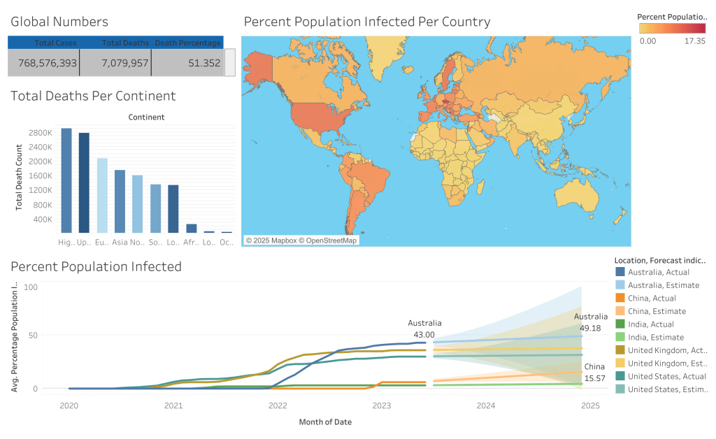 A Data Analysis Project that explores the available COVID-19 data from Our World in Data in SQL, Tableau, and Python. The purpose of this project is to showcase the world of COVID-19 through the lens of a data analyst and how this information can be presented to people in an easy-to-understand manner.
