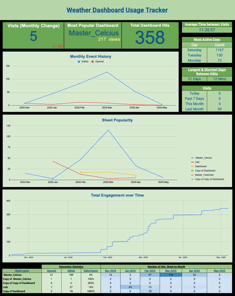 After releasing the Dasboard (above) publicly, it has received consistent traffic (and usage) since 2021. To monitor its usage over time (starting 17/11/2024), I create a Dashboard that logs user interactions — document opens and edits. Using a series of functions, including LET, ARRAYFORMULA, SUBSTITUTE, IMPORTRANGE, QUERY, and SUMPRODUCT, the Dashboard uses a collection of custom-built formulas and Pivot Charts that automatically update with any user interaction in real-time.